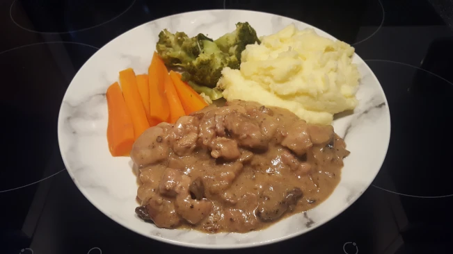 An umptuous sliky, buttery mash and freshly steamed veg' are just heavenly when served with Chicken In Creamy Peppercorn Sauce